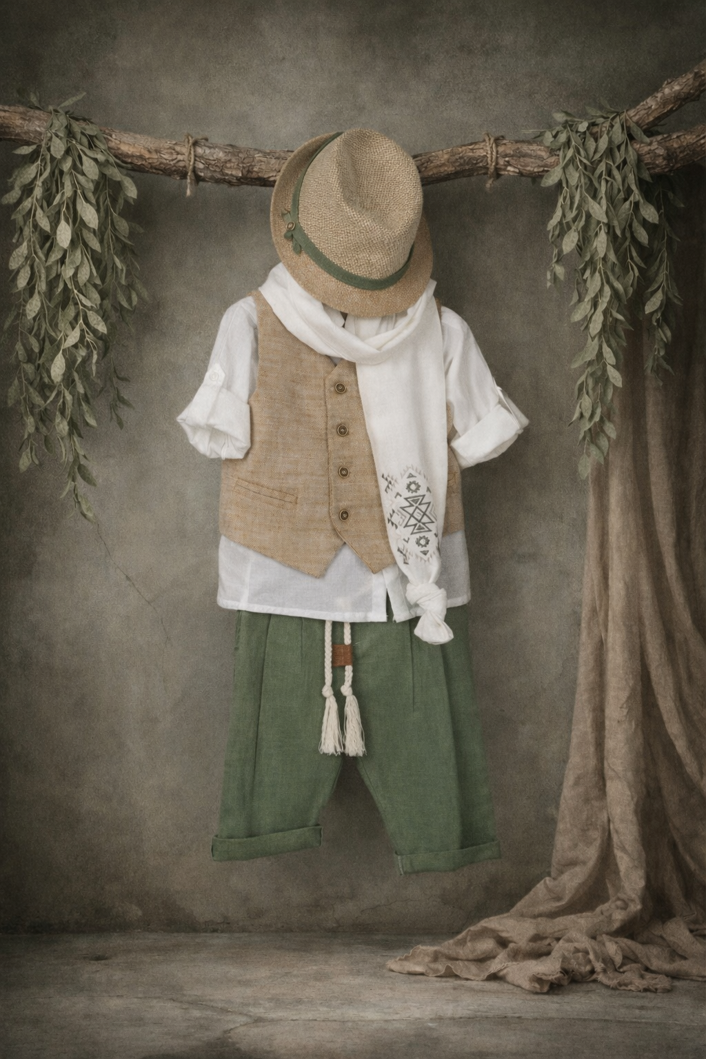 Classic and modern βαπτιστικό ρούχο. Αποτελείται από πράσινο λινό παντελόνι, εκρού βαμβακερό πουκάμισο και all-time classic μελί γιλέκο. Αξεσουάρ είναι το εκρού-ταμπά κορδόνι για ζώνη, το μελί καβούρι και το chic φουλάρι με κέντημα.