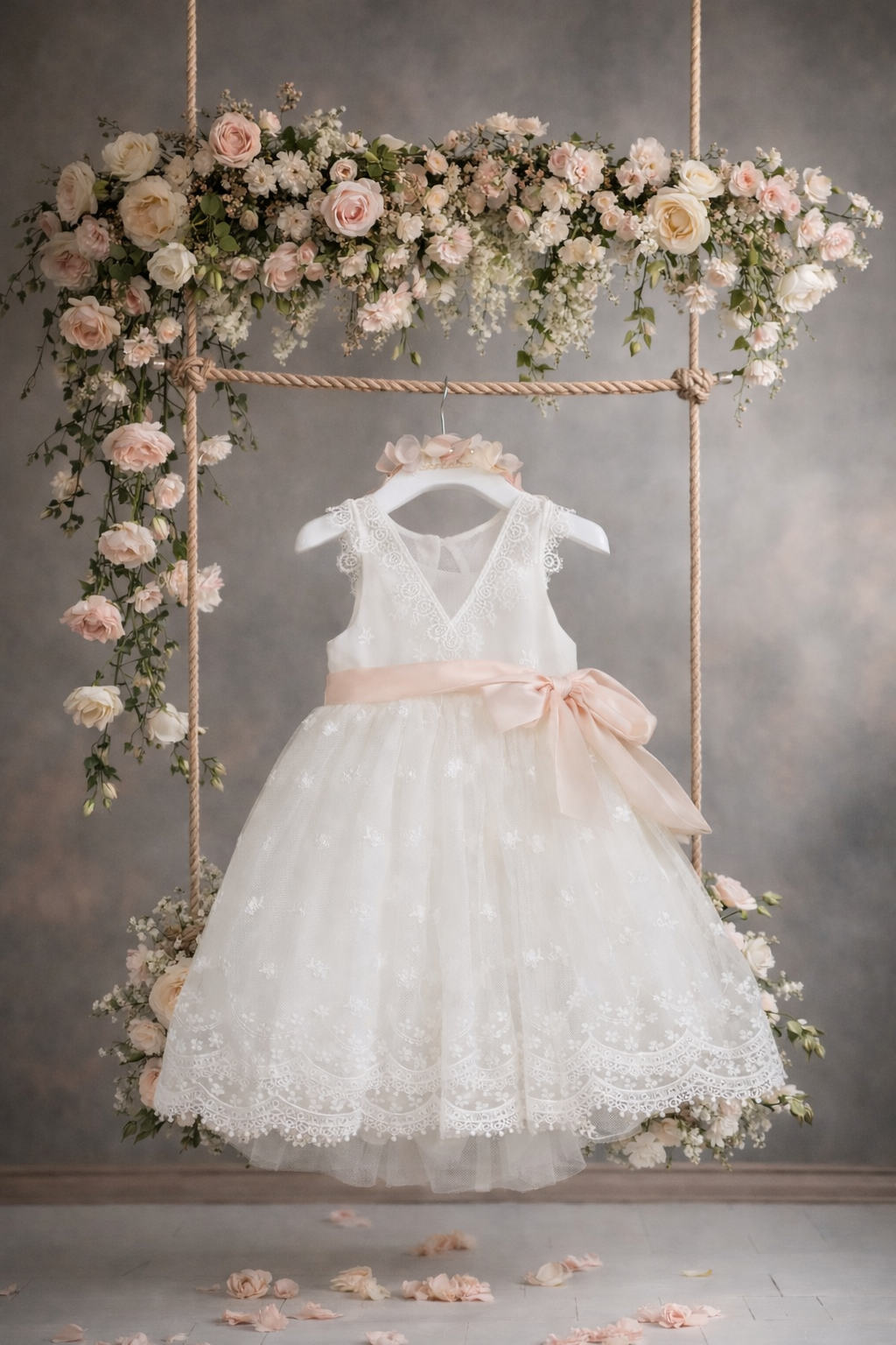 Ένα ιβουάρ δαντελένιο φόρεμα εξαιρετικής ποιότητας με ζώνη σε Νούντ χρώμα. Μία classic σικ επιλογή που το ολοκληρώνει στεφανάκι με χειροποίητα λουλούδια.