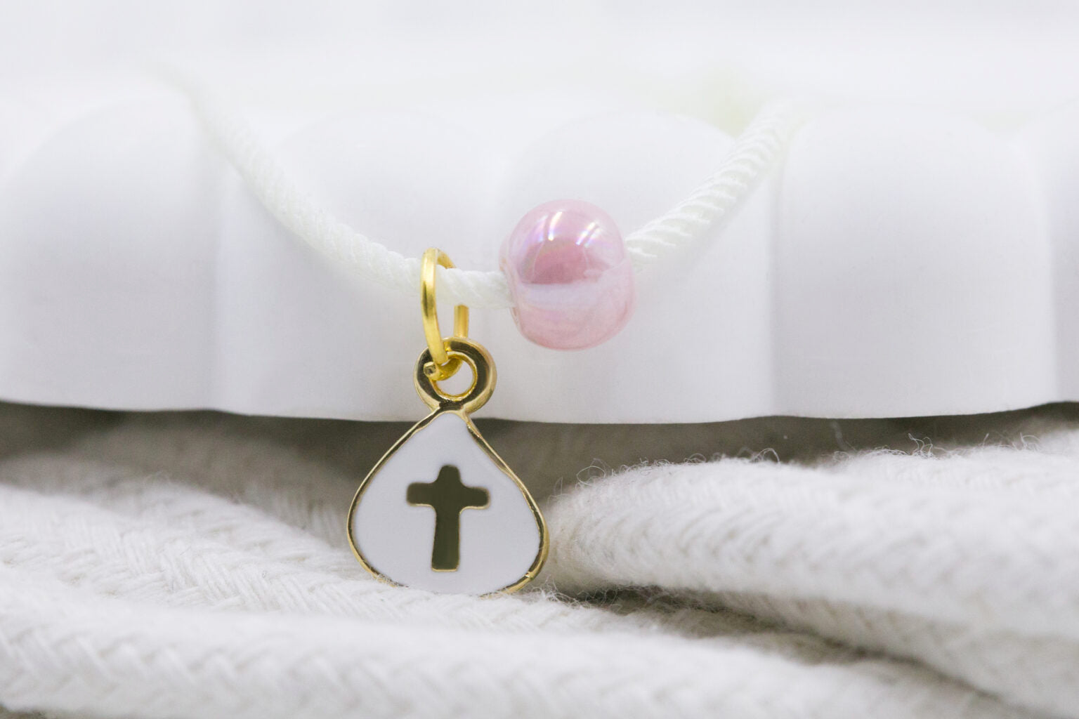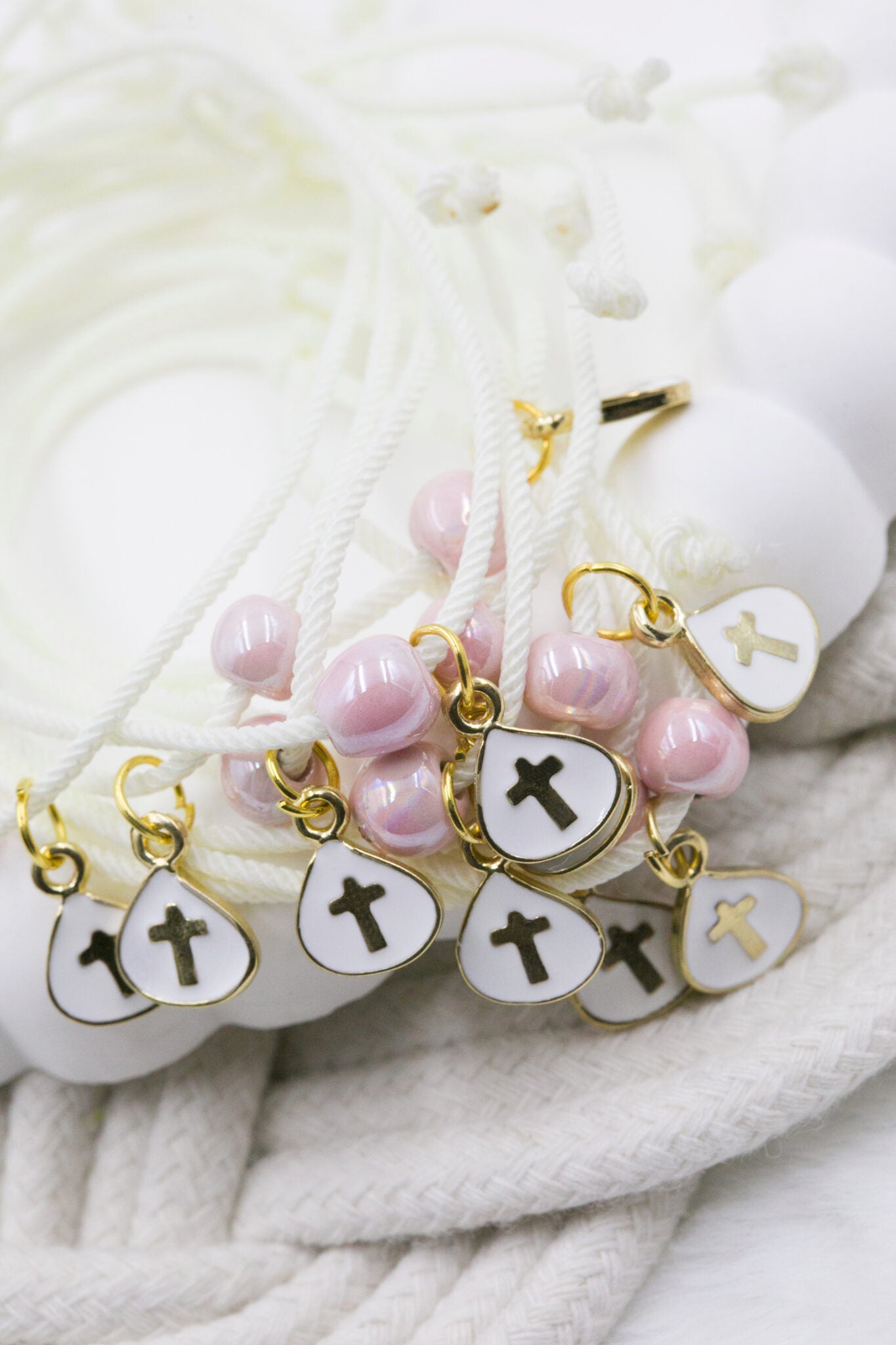 Μαρτυρικό βραχιόλι με σταυρό σμάλτο λευκό, στριφτό κορδόνι και κεραμική χάντρα ροζ. Οι φωτογραφίες έχουν υποστεί επεξεργασία και τα χρώματα ίσως να διαφέρουν λίγο στην πραγματικότητα. Η τιμή αφορά συσκευασία 50 τεμαχίων.
