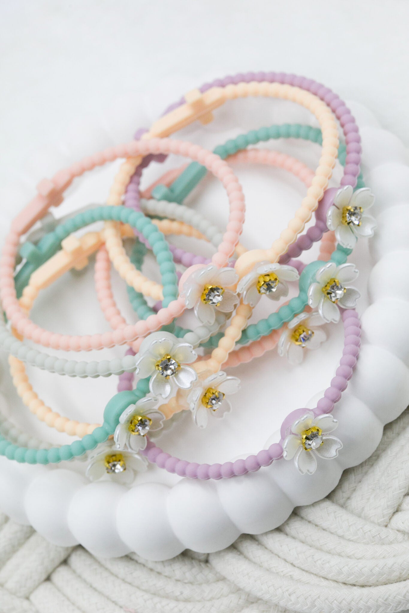 Μαρτυρικό βραχιόλι σε διάφορα χρώματα με λουλούδι ακρυλικό και στρας. Οι φωτογραφίες έχουν υποστεί επεξεργασία και τα χρώματα ίσως να διαφέρουν λίγο στην πραγματικότητα. Η τιμή αφορά συσκευασία 50 τεμαχίων.