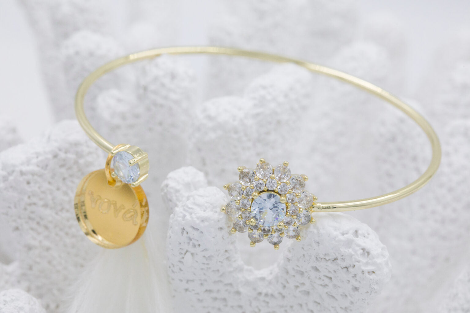 Χειροπέδα, με ζιργκόν σε σχέδιο λουλούδι, φτερό λευκό, για την μαμά, νονά. Οι φωτογραφίες έχουν υποστεί επεξεργασία και τα χρώματα ίσως να διαφέρουν λίγο στην πραγματικότητα. Η Τιμή αφορά συσκευασία 2 τεμαχίων.