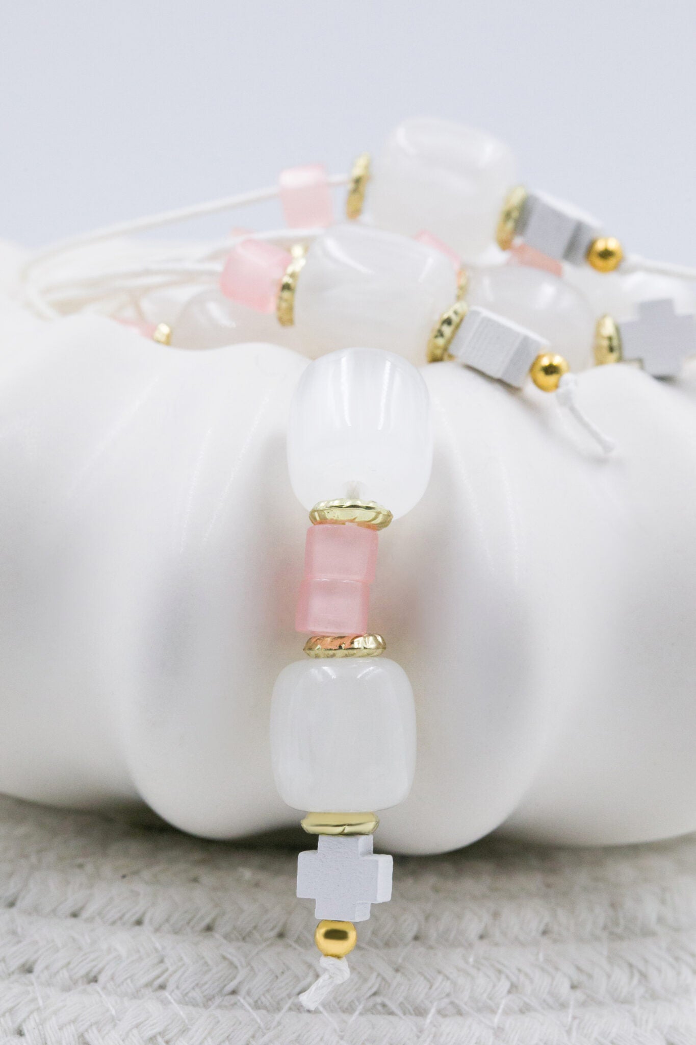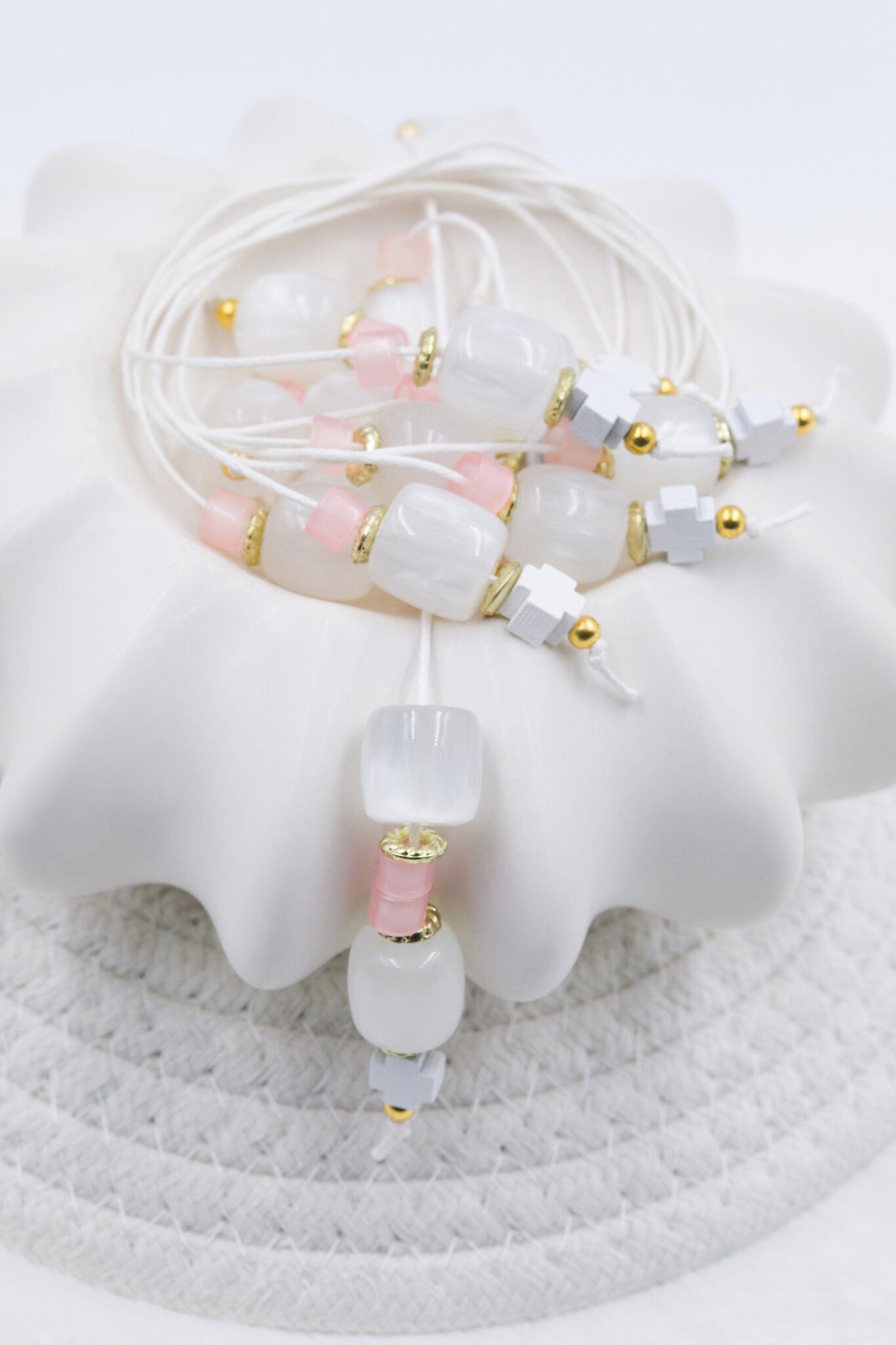 Μαρτυρικό μπεγλέρι με λευκές και ροζ χάντρες, σταυρός ξύλινος λευκός.Οι φωτογραφίες έχουν υποστεί επεξεργασία και τα χρώματα ίσως να διαφέρουν λίγο στην πραγματικότητα. Η τιμή αφορά συσκευασία 50 τεμαχίων.