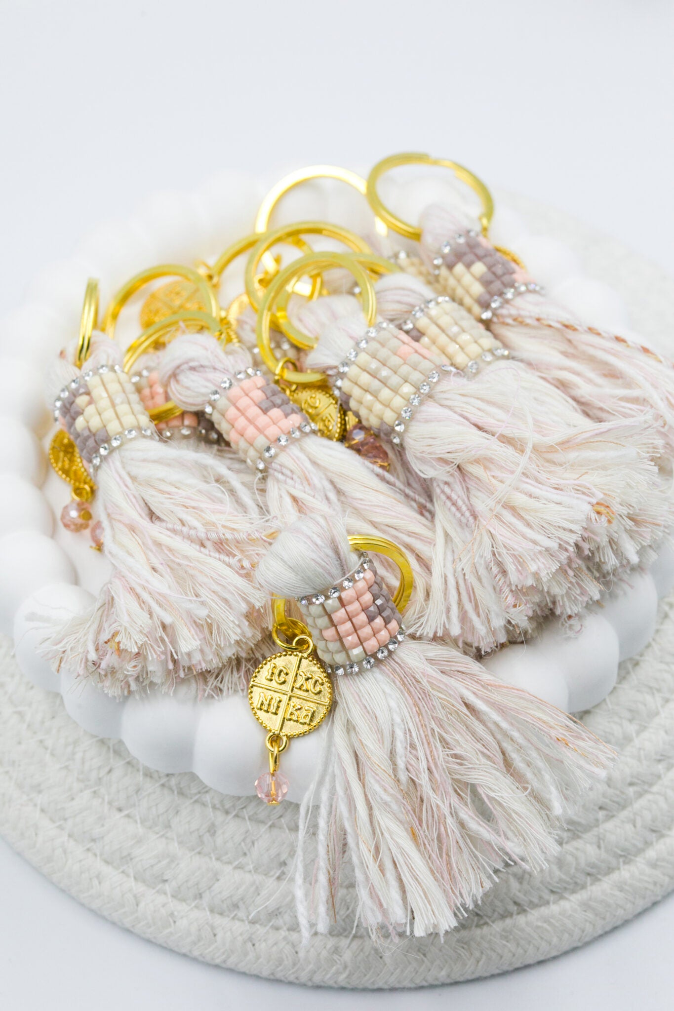 Μαρτυρικό μπρελόκ χειροποίητη φούντα σε χρώμα εκρού Σ. μήλο κωνσταντινάτο και κρύσταλλο ροζ. Οι φωτογραφίες έχουν υποστεί επεξεργασία και τα χρώματα ίσως να διαφέρουν λίγο στην πραγματικότητα. Η τιμή αφορά συσκευασία 50 τεμαχίων.
