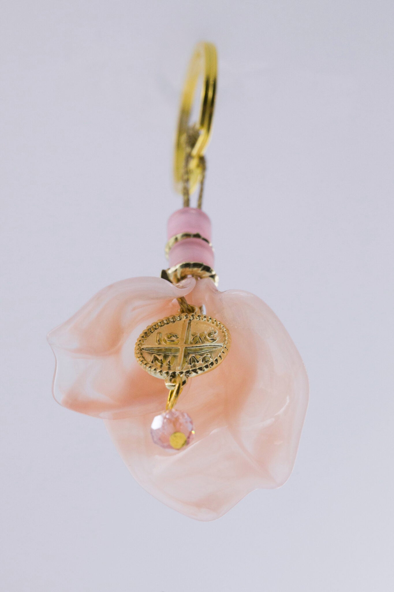 Μαρτυρικό μπρελόκ με σομόν ακρυλικά πέταλα, σταυρό κωνσταντινάτο και κρύσταλλο. Οι φωτογραφίες έχουν υποστεί επεξεργασία και τα χρώματα ίσως να διαφέρουν λίγο στην πραγματικότητα. Η τιμή αφορά συσκευασία 50 τεμαχίων.