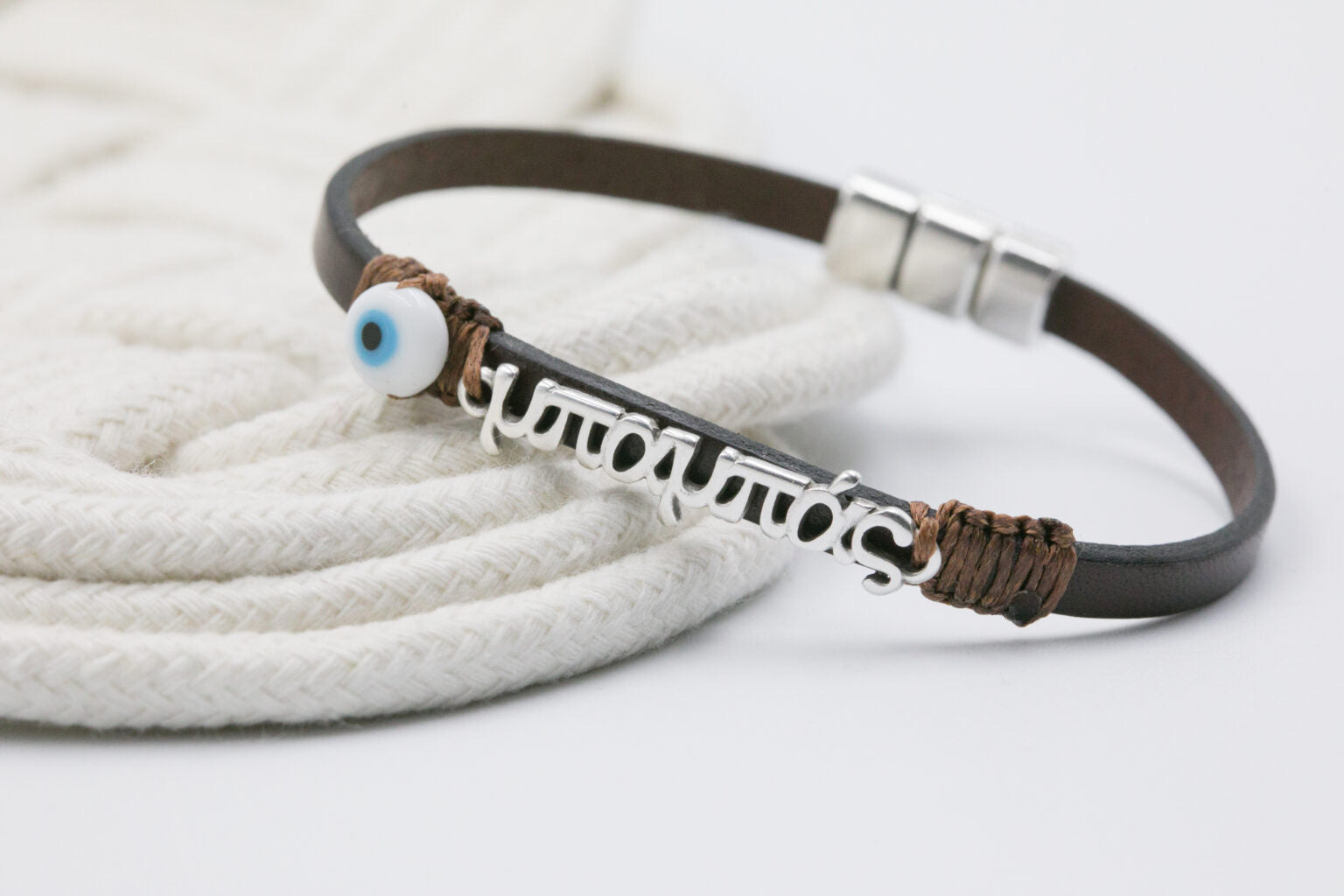 Δερμάτινο μαρτυρικό βραχιόλι με κλείσιμο μαγνήτη, περαστό μάτι λευκό γυάλινο και μπαμπάς- νονός μεταλλικό. Οι φωτογραφίες έχουν υποστεί επεξεργασία και τα χρώματα ίσως να διαφέρουν λίγο στην πραγματικότητα. Η Τιμή αφορά συσκευασία 2 τεμαχίων.