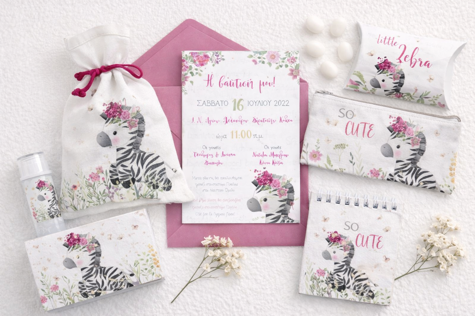 Προσκλητήριο βάπτισης για κορίτσι με θέμα Cute Zebra.