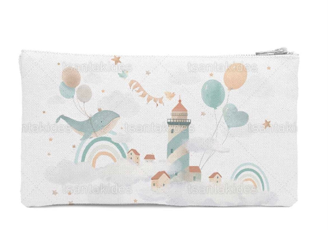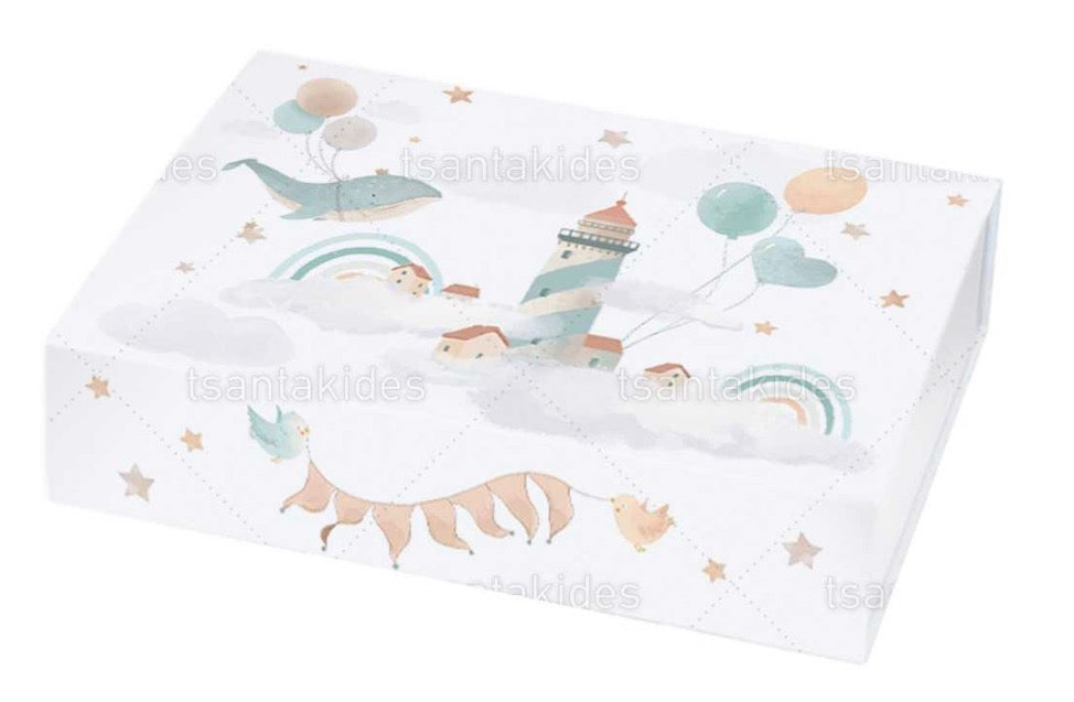 Προσκλητήριο βάπτισης για αγόρι με θέμα Flying Whale with Balloons.